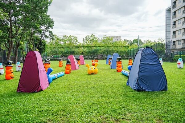 ☆場地安全佈置:平坦草地+沐浴帳+毛毛蟲+不倒翁+充氣大氣球等五種安全掩體,讓孩童戶外活動安全無疑慮,這也是全台戶外水彈首創。